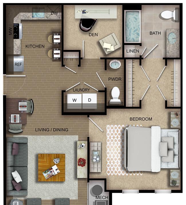 1 bed, 1.5 baths, 641 sqft